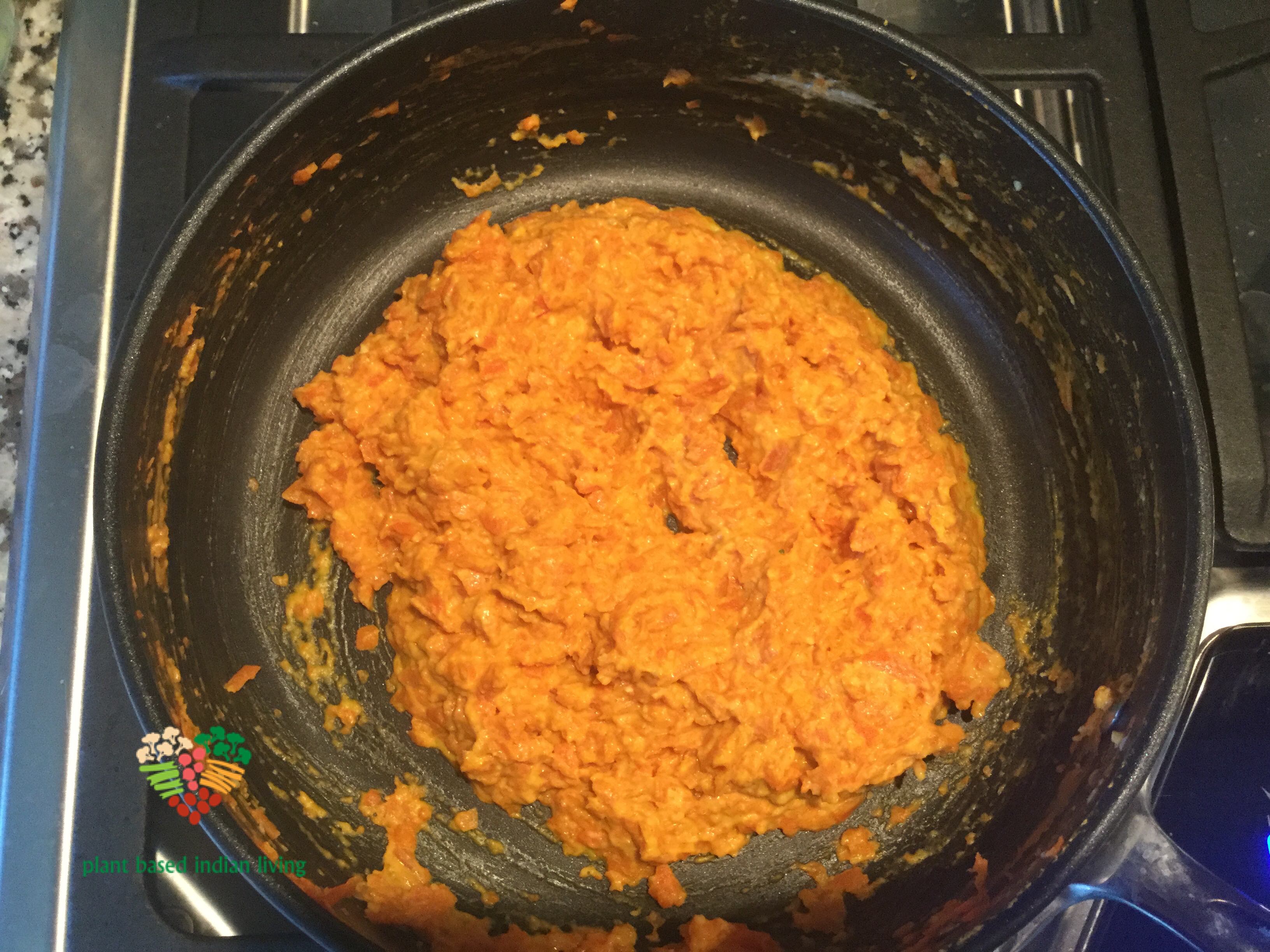 6. Add cashew cream to the saucepan. Mix carrots and cashew cream well for 3-4 mins.