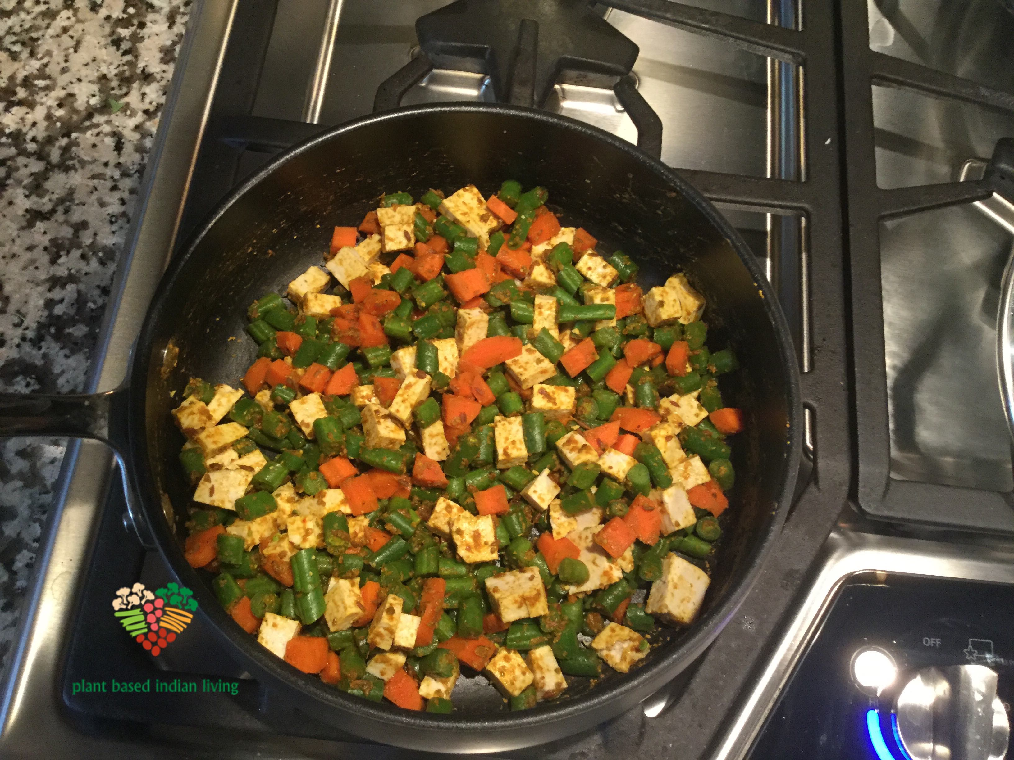 What do you do when you have green beans, carrots and pressed tofu in your fridge? You cook them. Cook these bright colorful vegetables with tofu ,and add flavors of Indian spices, to create an incredibly tasty dish.