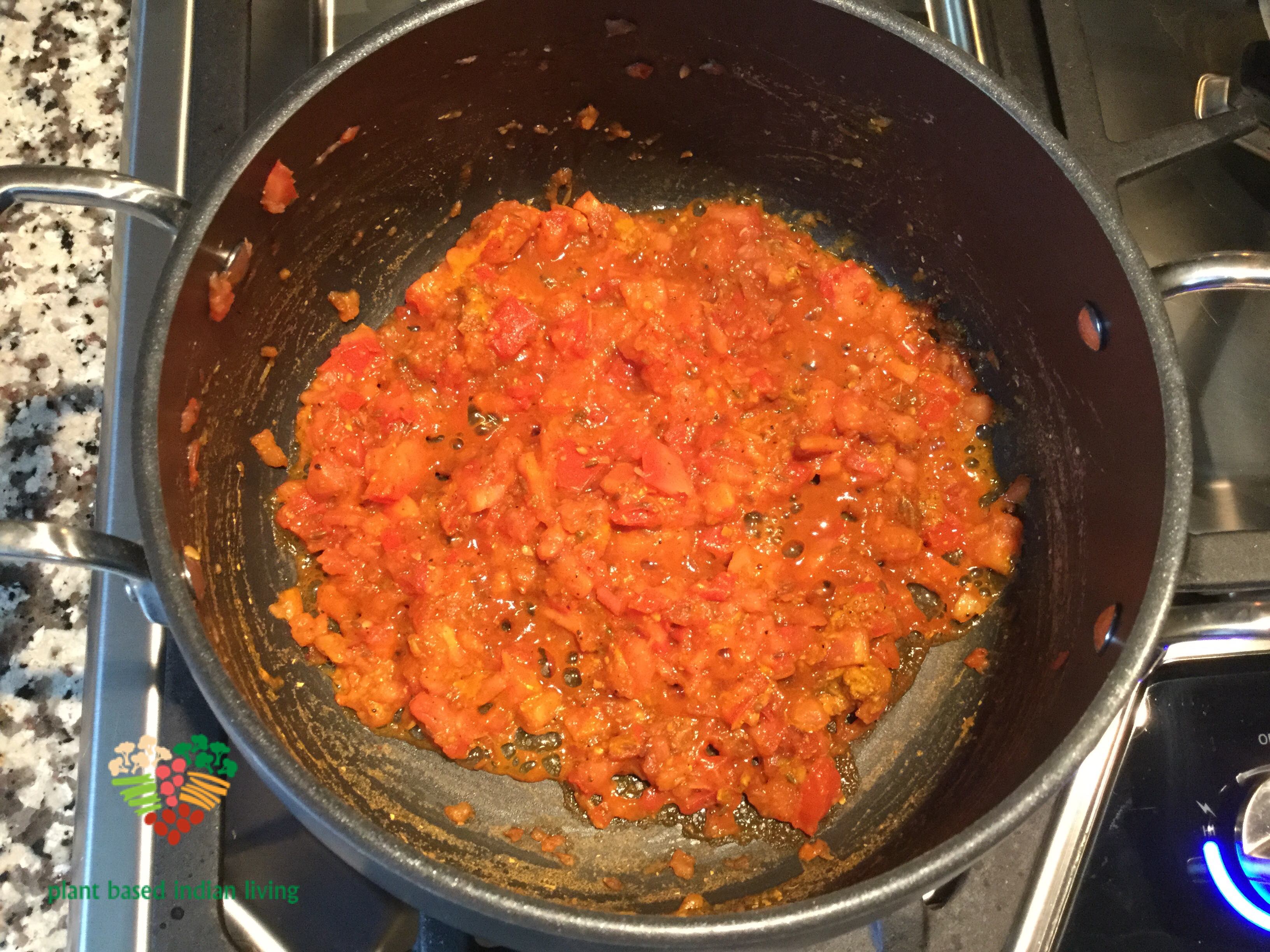 4. Add tomato with ginger in the saucepan. Mix and cook until the mixture turns soft or into a paste.