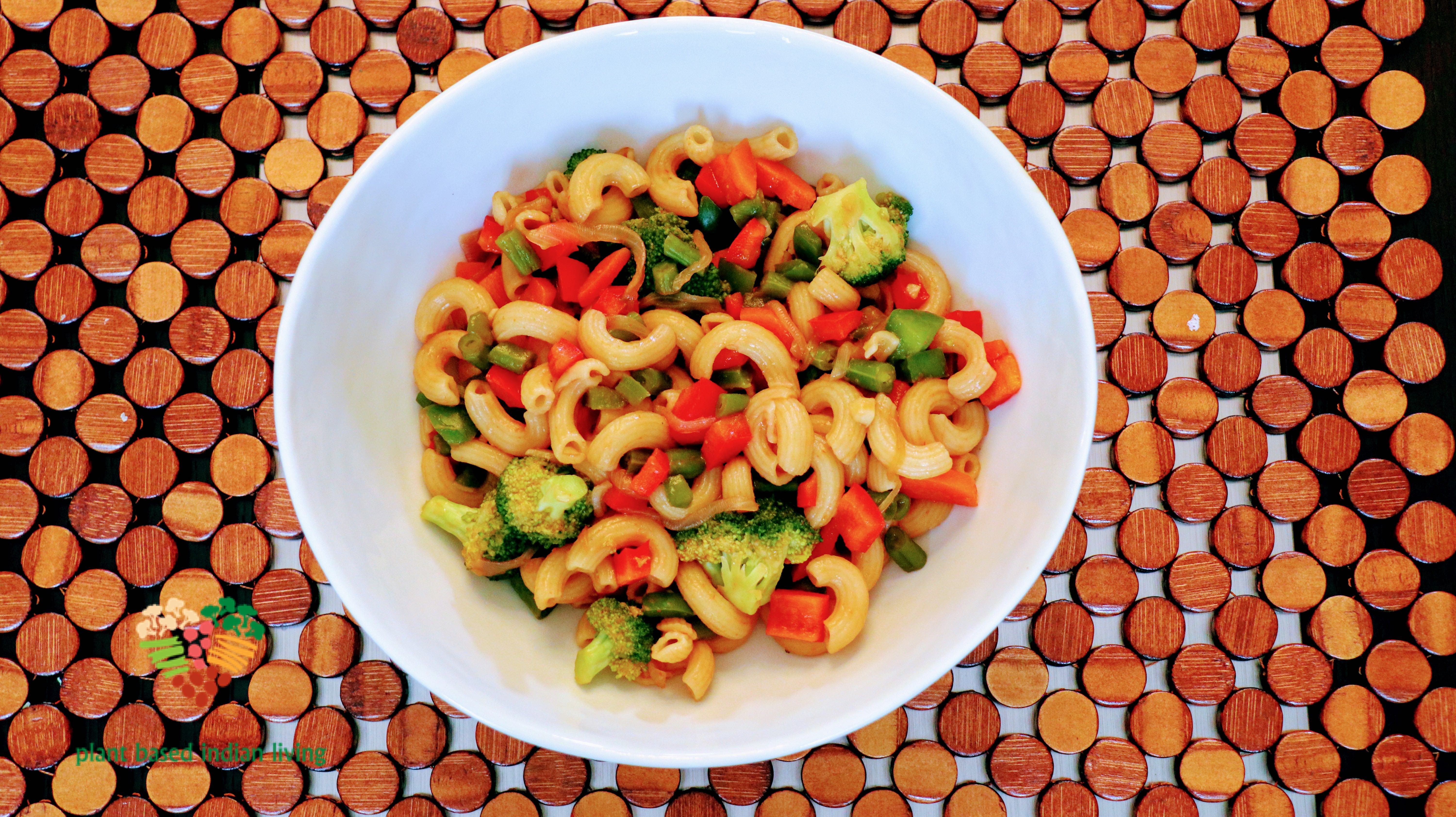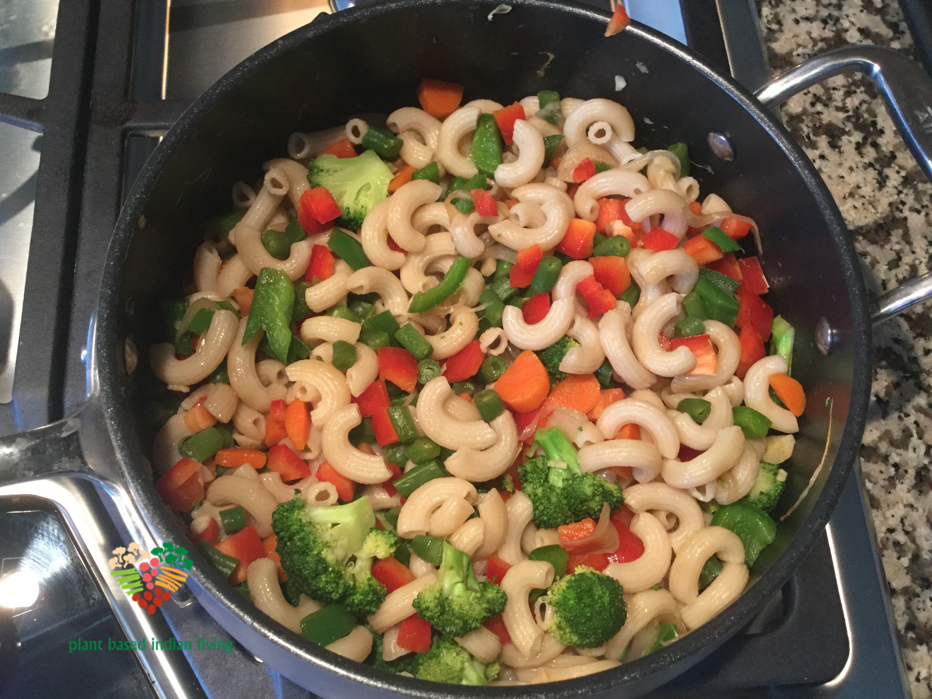 I learned this recipe from my mother-in-law in India (thank you, mom). She is a great cook but I had to alter her recipe because in India we use white flour for pasta/macaroni and a lot of oil while sautéing vegetables. So I thought to be a little experimental and comply close to my lifestyle. I used brown rice elbows and add extra vegetables to add volume but it also makes it more bright and colorful.