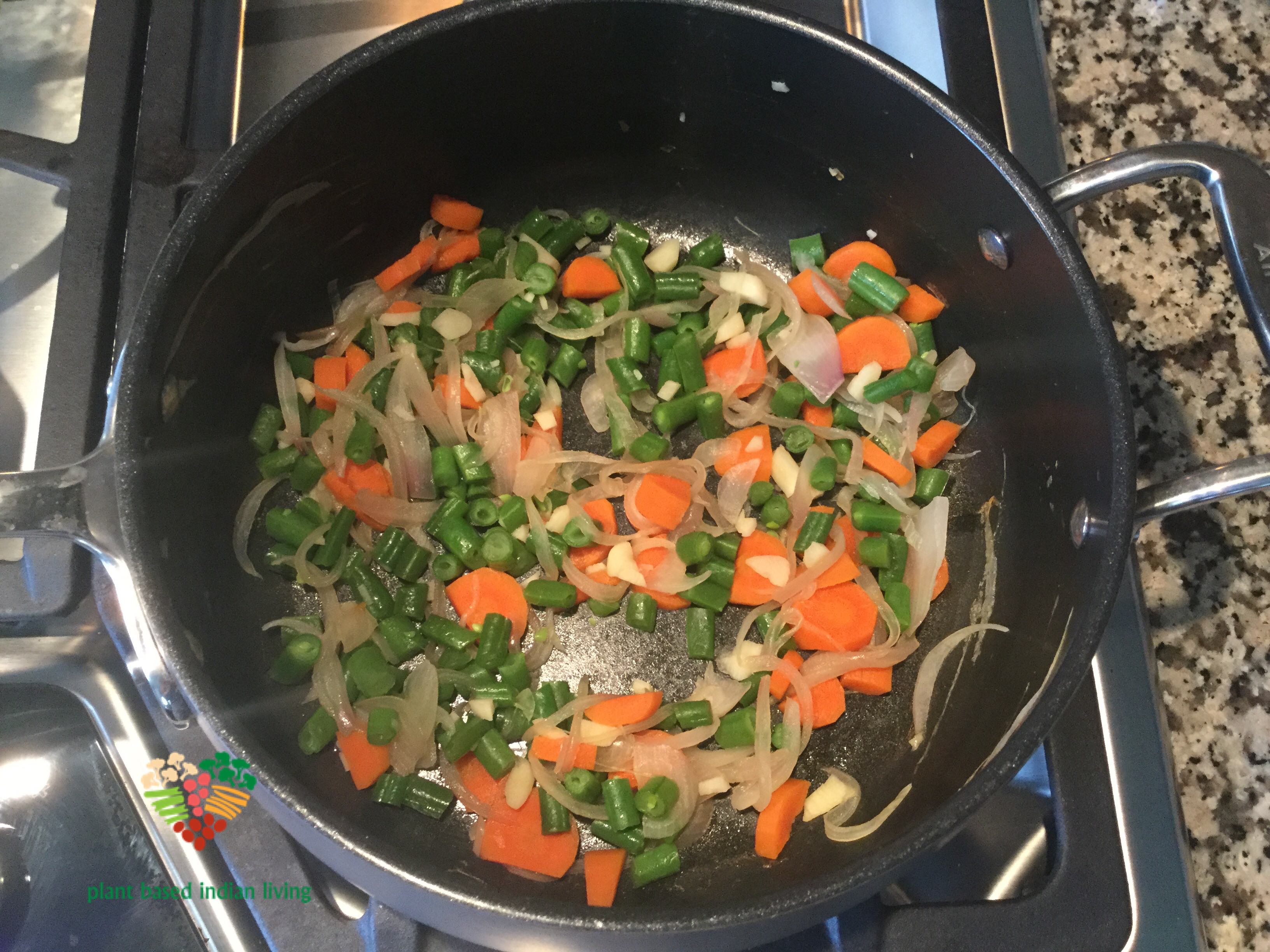 3. Add green beans, carrots and garlic with 3 tbsp of water to cook with onions. Cover the lid after adding water.