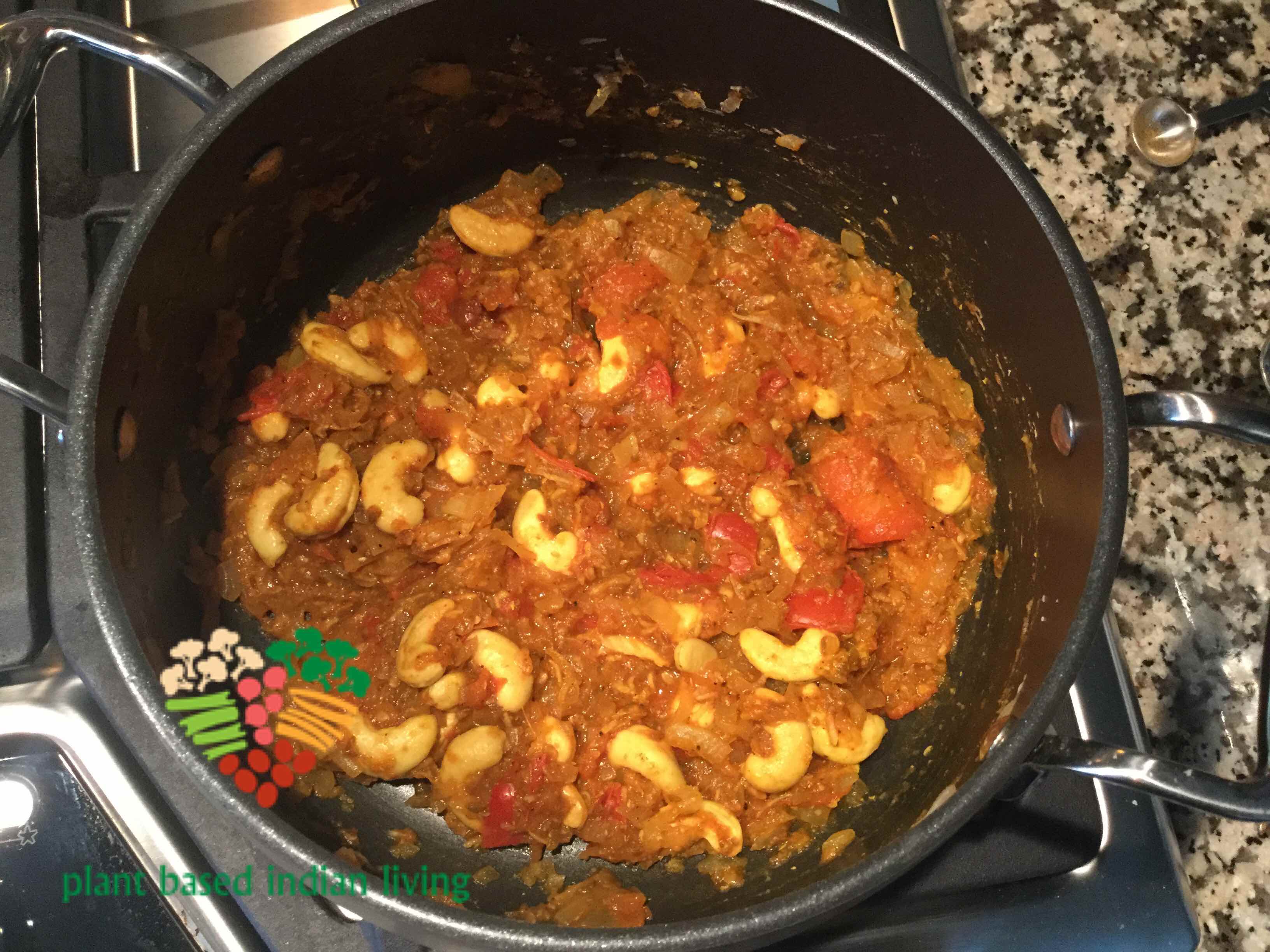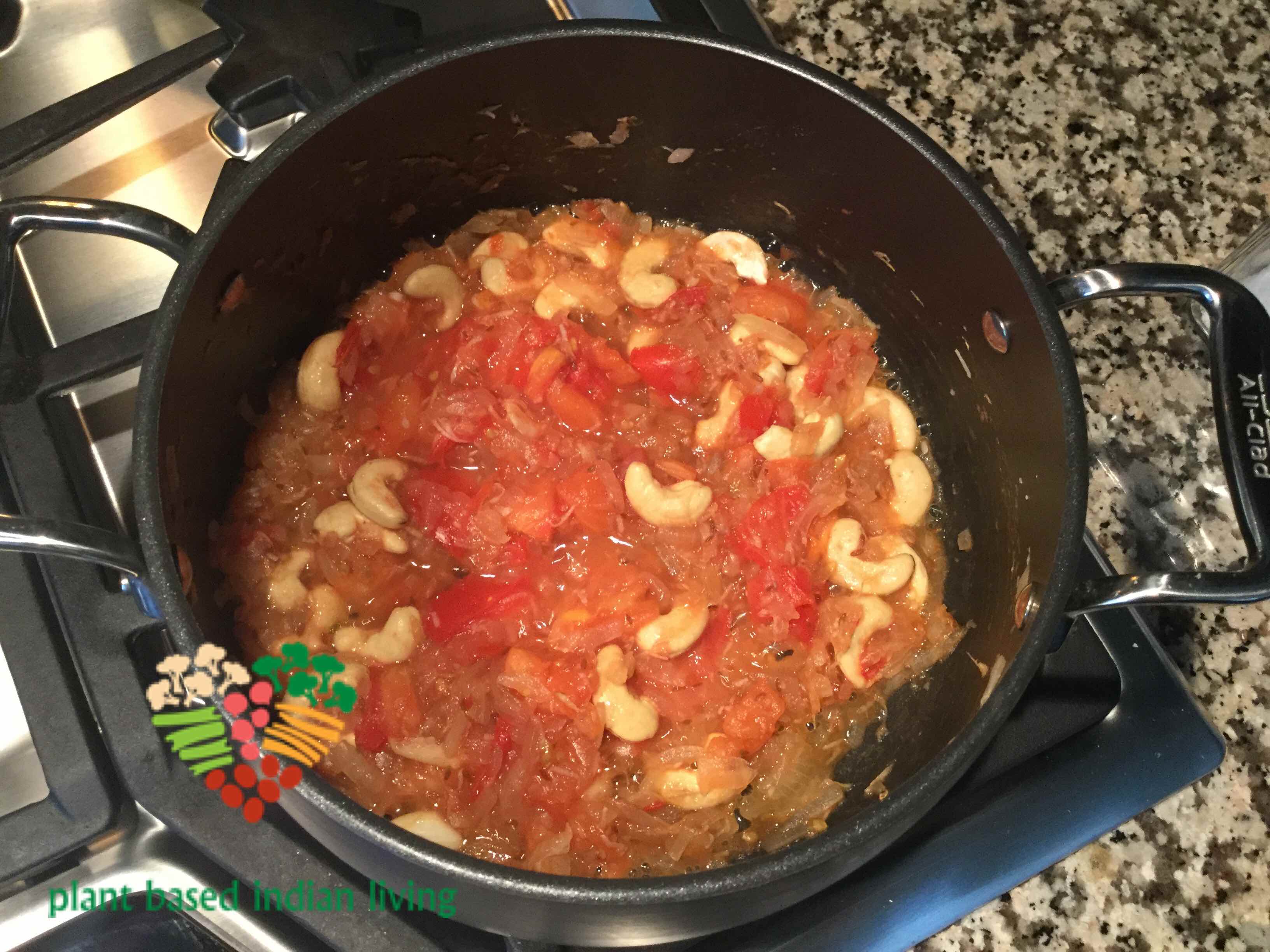 5. Add turmeric powder, red chili powder, garam masala, coriander powder, and cashews to onions and tomatoes in the saucepan. Stir for 3 mins.