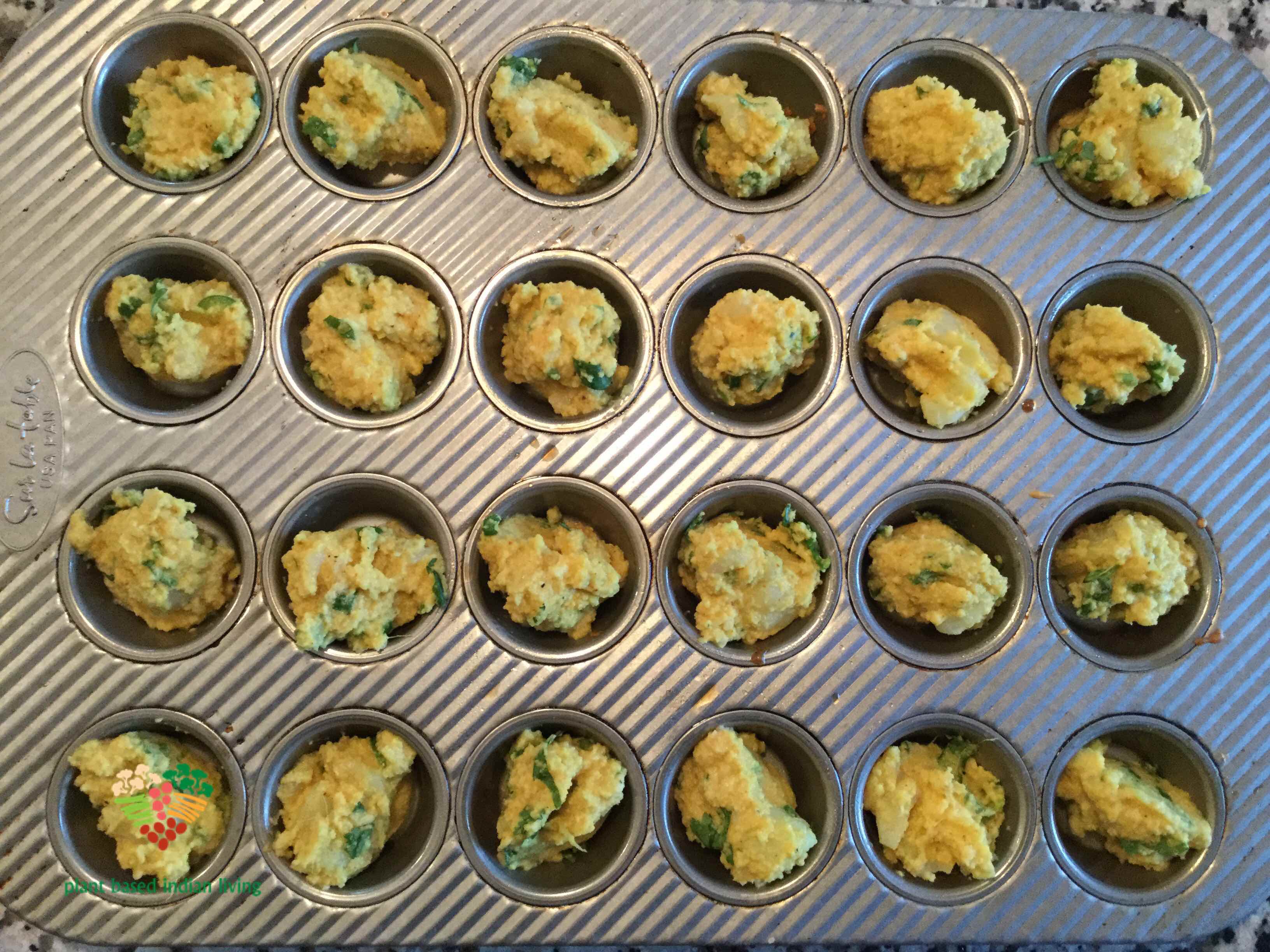 5. Take a small muffin tray. With the help of tablespoon, scoop the pakora (fritters) batter and pour in the muffin tray.